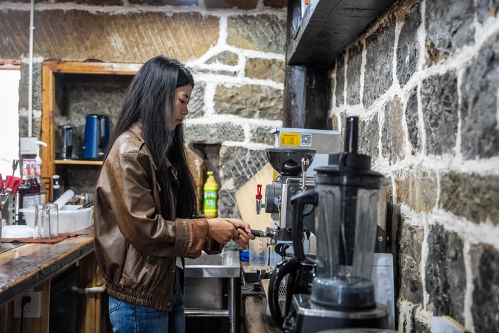 云南省威信县水田镇龙洞村湾头村民小组,村民在自家的咖啡馆里制作咖啡。