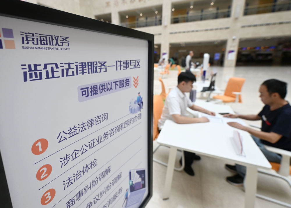 天津市滨海新区政务服务中心,工作人员在“涉企法律服务一件事”专区为市民提供服务。