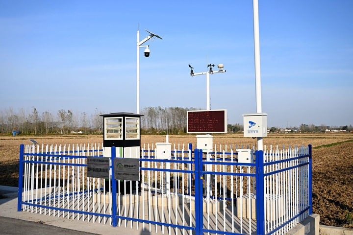 安徽省合肥市长丰县下塘镇拍摄的种粮大户孟祥保田头的农情智慧监测设施。