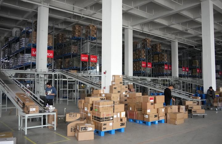 临沂商城的物流仓储区,工作人员在配送货物。