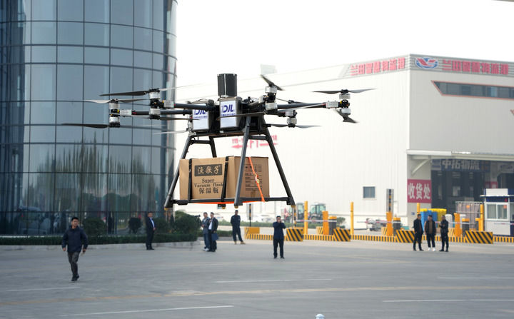 临沂现代物流城,一架无人机在配送货物。
