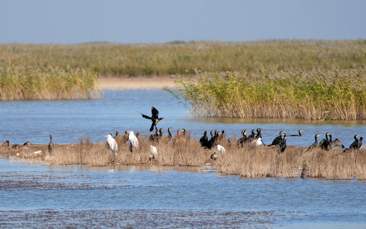 野生鸟类在黄河三角洲国家级自然保护区栖息。
