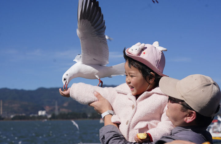 小朋友在云南省昆明市滇池海埂观景大道投喂红嘴鸥。