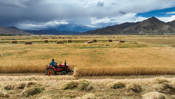 西藏日喀则市白朗县巴扎乡拍摄的秋收场景。
