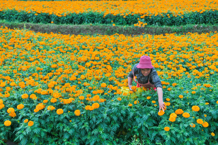 村民在贵州省威宁县双龙镇高坡村采摘万寿菊。