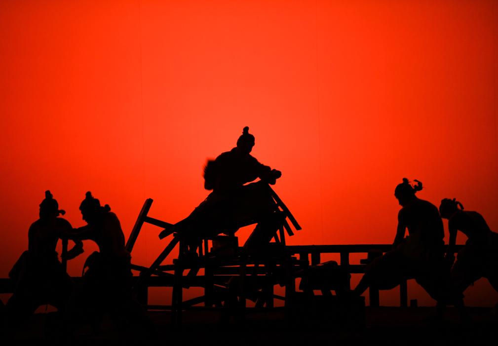 以“云梦睡虎地黑夫木牍”为灵感创排的大型历史舞台剧《赳赳大秦》演出现场。