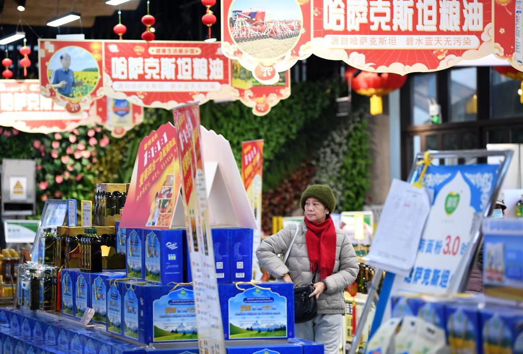 消费者在“中欧班列(西安)进口商品年货节”上挑选哈萨克斯坦粮油产品。