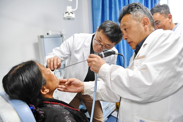 中国医学科学院整形外科医院王克明博士(左后)和西藏自治区人民医院巴罗主任(右前)为患者查体。