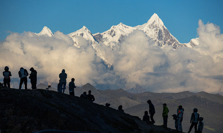 游客在色季拉山口的川藏公路边观赏南迦巴瓦峰风光。