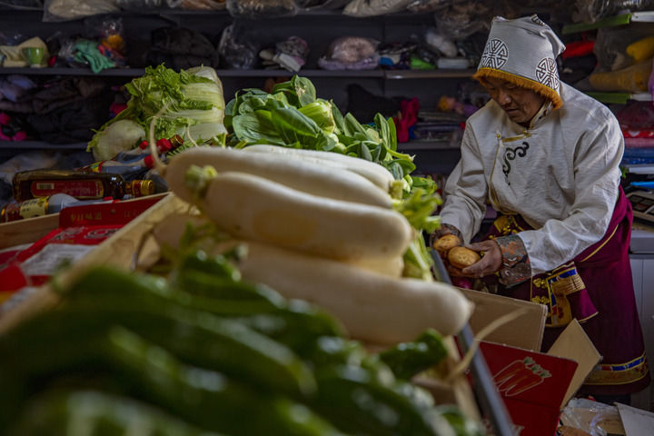西藏那曲市申扎县马跃乡贝嘎四村偏远乡镇果蔬配送试点项目直销点,店主西热加措在整理供销合作社配送来的新鲜蔬菜。