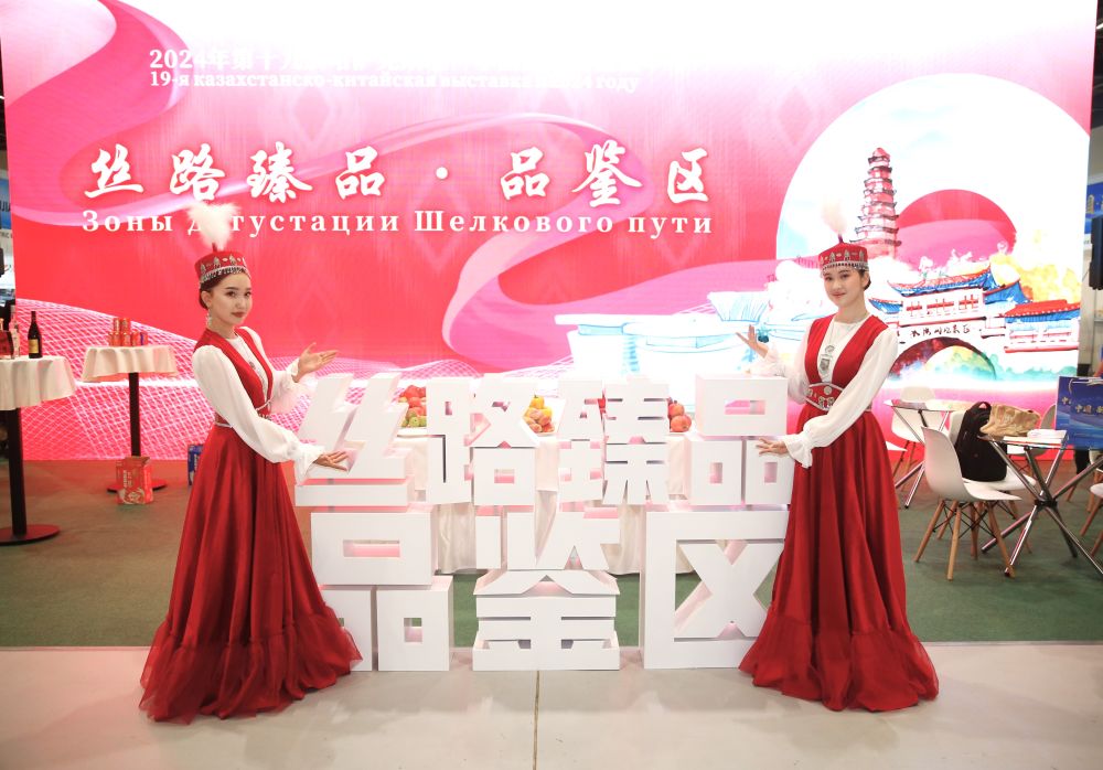 哈萨克斯坦阿斯塔纳,身着民族服饰的工作人员在第十九届哈萨克斯坦—中国商品展览会上欢迎观展民众。