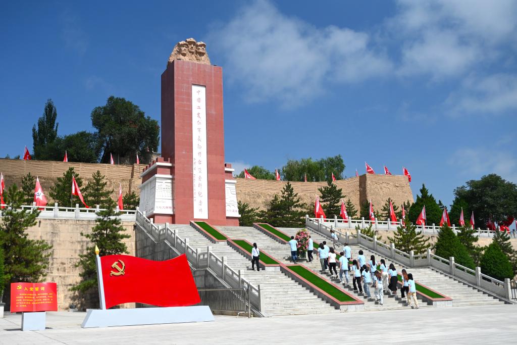 大学生向中国工农红军长征将台堡会师纪念碑敬献花篮。