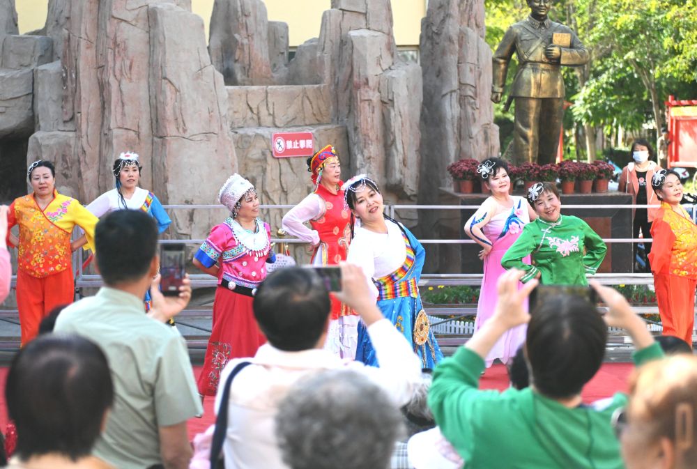 居民在宁夏银川市金凤区长城花园社区广场表演舞蹈。