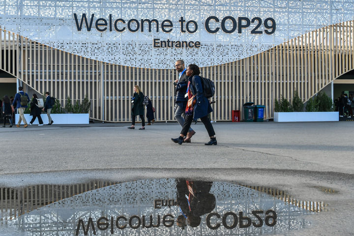 在阿塞拜疆首都巴库,人们经过联合国气候变化巴库大会的会场。