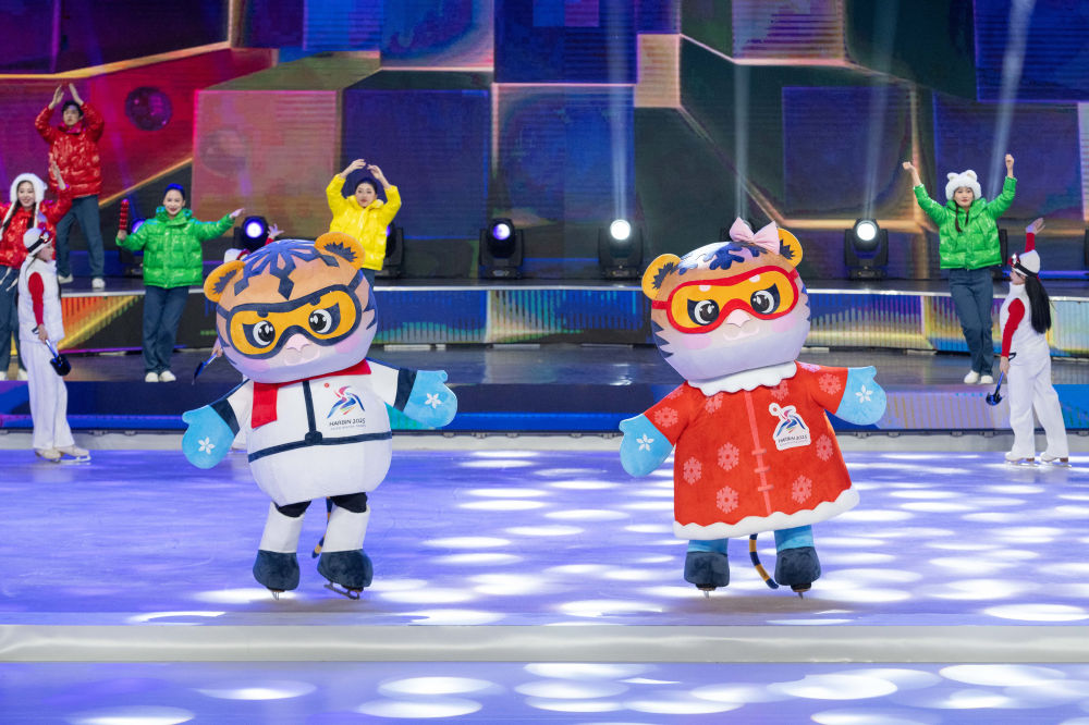 2025年第九届亚洲冬季运动会倒计时300天主题活动在哈尔滨举行,吉祥物“滨滨”(前左)、“妮妮”(前右)在活动现场表演。