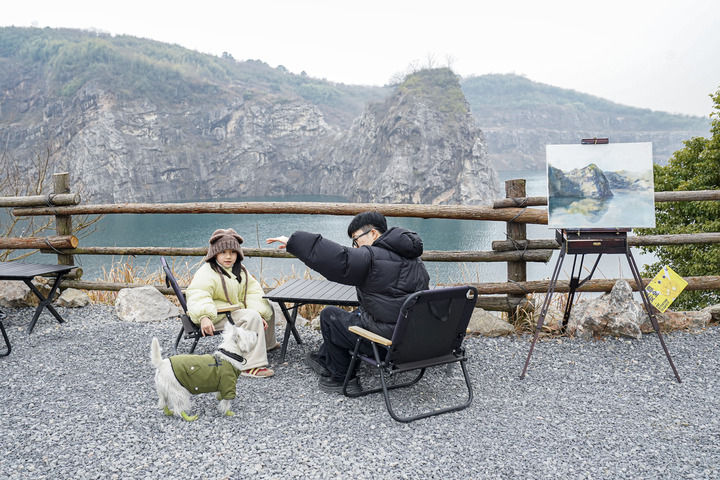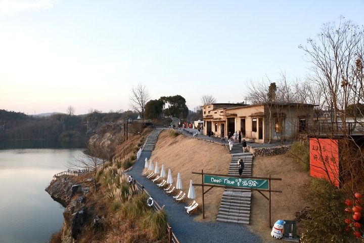 游客在安吉梅溪镇红庙村“深蓝计划”咖啡馆的矿坑边休闲赏景。