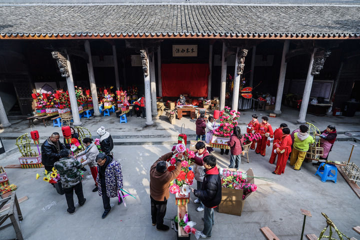 在浙江省诸暨市安华镇丰江周村,文化特派员带领青年志愿者和村民共同赶制板凳龙。