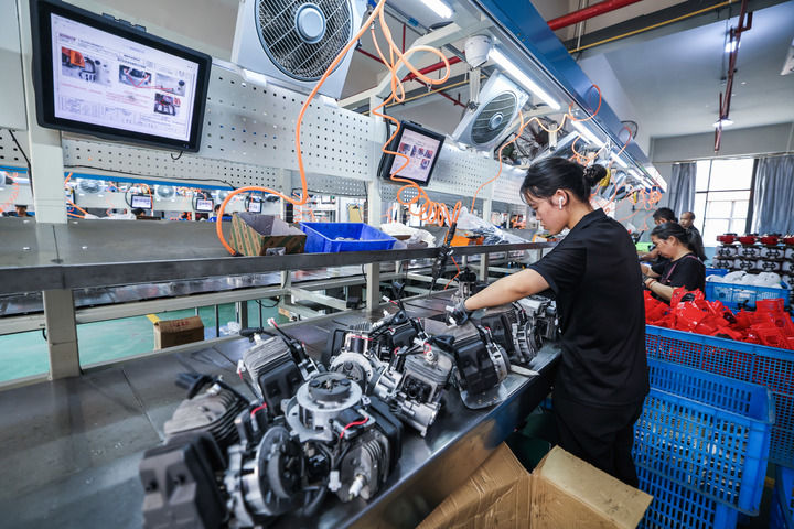 在浙江省金华市金东区曹宅镇的浙江托马斯工具制造有限公司数字化车间内,工人在流水线上生产出口的园林机械。近年来,金华市金东区大力推动数字化改造,聚焦智能家居、电动(园林)工具等主导行业,以场景应用带动“智改数转网联”项目建设。