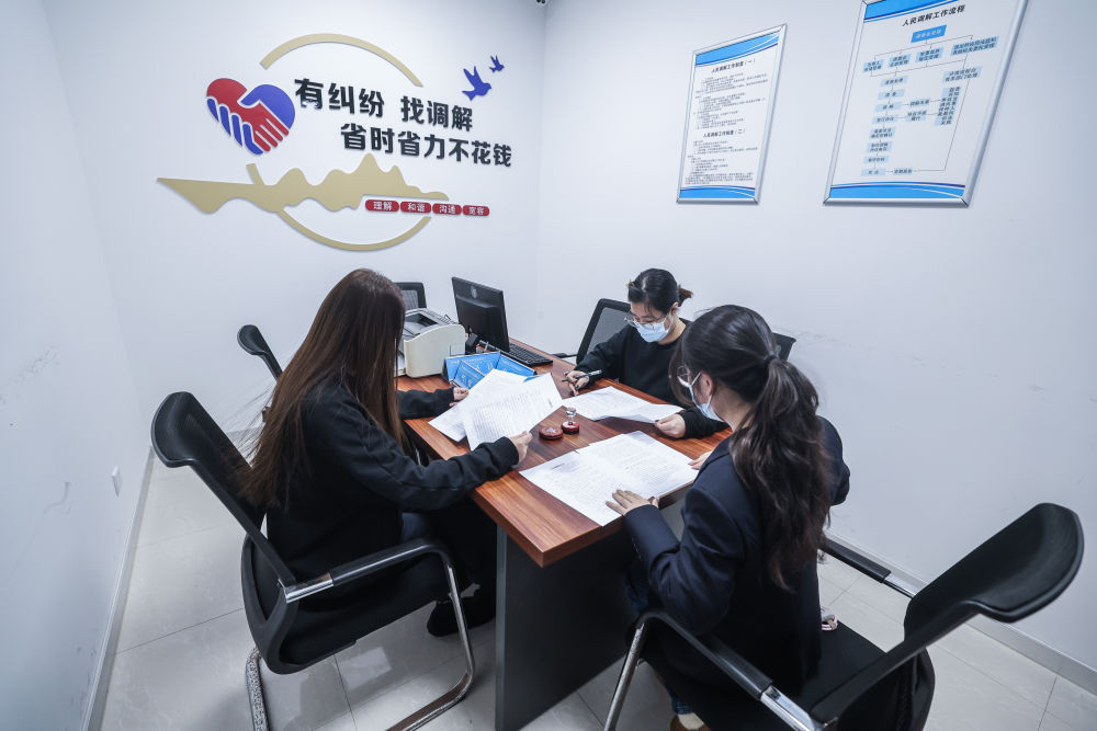 在浙江省嘉兴市南湖区社会矛盾纠纷调处化解中心,调解员(右一)在调解金融借款合同纠纷。
