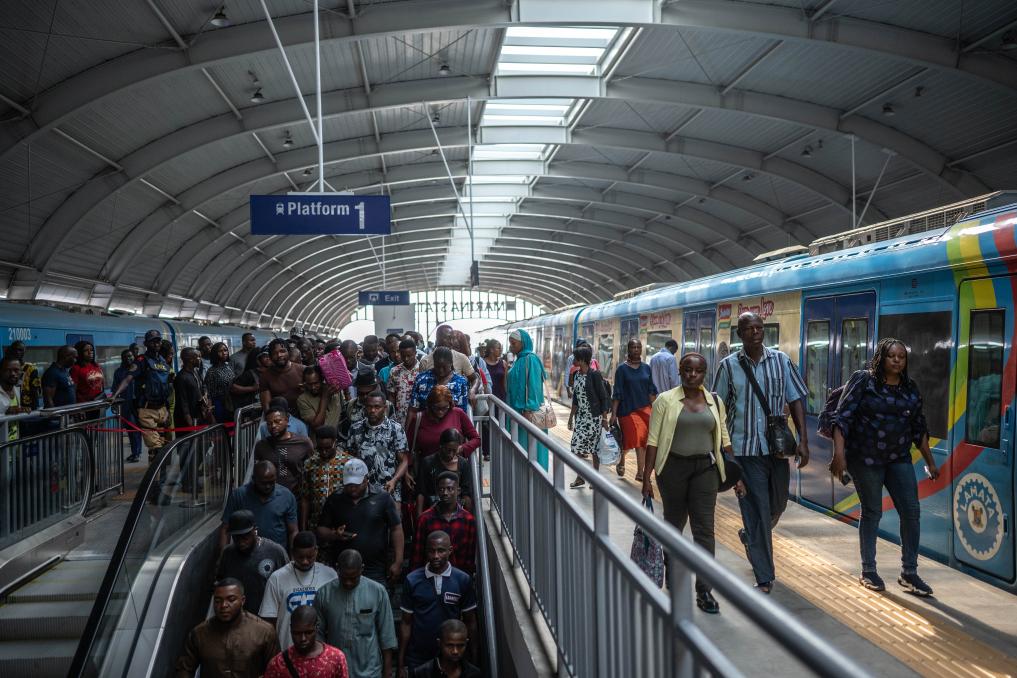 在尼日利亚拉各斯,乘客走在轻轨蓝线的站台上。拉各斯轻轨蓝线是西非地区首条由中国企业自主设计、建造、施工、运营的电气化城市轨道交通项目。