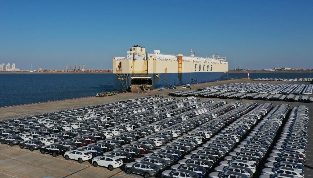 来自京津冀地区的超4000辆国产自主品牌汽车在天津港环球滚装码头等待装船发往海外。