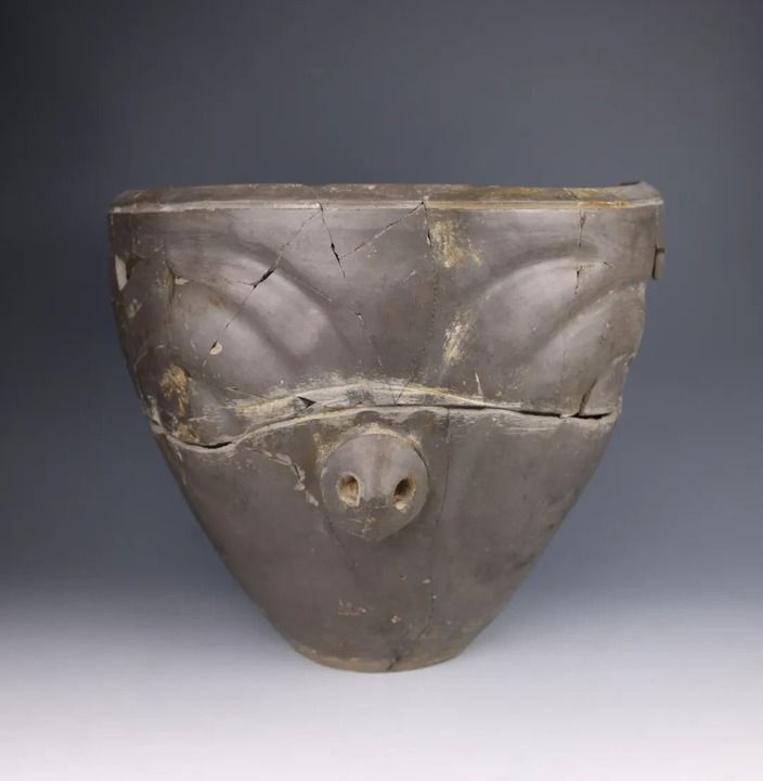 然而,马家窑人的艺术创造力似乎远不止于此。寺洼遗址新出土的众多陶器展现出全新的造型与纹饰风格。如其中一件带有“猪鼻”的马家窑类型泥质灰陶,色泽深沉灰黑如夜,一只鼻子自陶胎中缓缓隆起,上方的弧形纹理像舒展的眉骨,又像张开的羽翼,一场古文明的梦境由此展开。