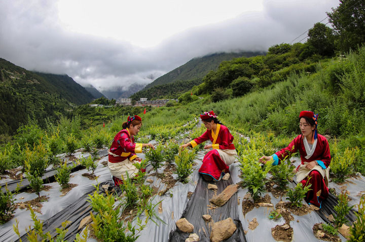安徽省援藏工作队在勒布沟引入莓茶种植,试验性种植30亩。这是当地村民在采摘莓茶。