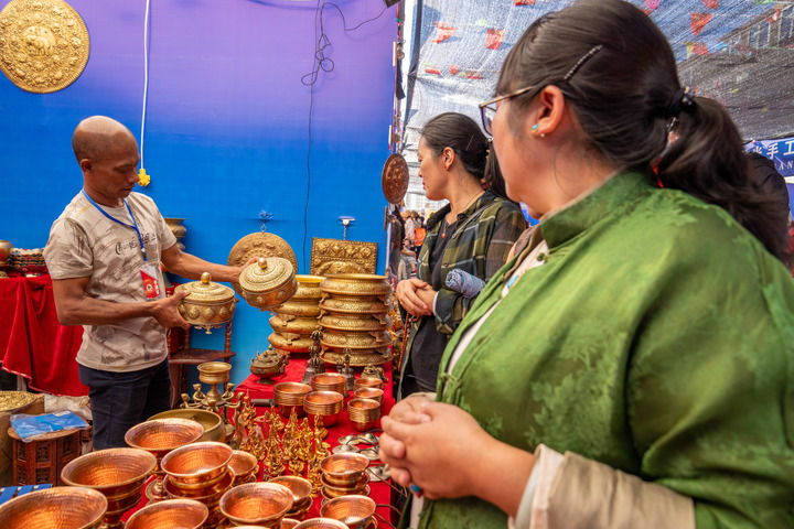 来自尼泊尔的商人阿曼在西藏昌都市首届尼泊尔进口商品展销会上向顾客展示商品。