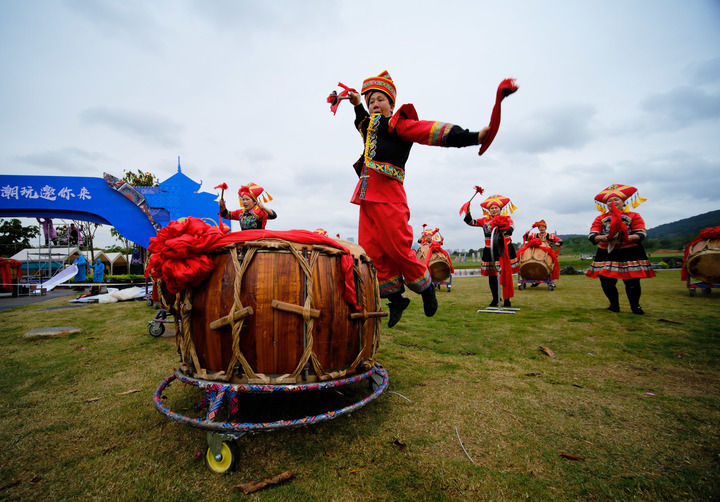 演员在广西南宁青秀山风景区表演节目,迎接“三月三”佳节的到来。