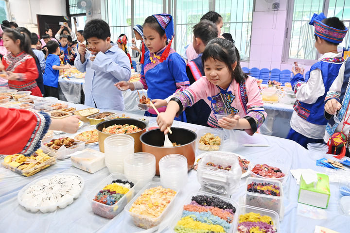 孩子们在广西南宁市民族大道东段小学品尝美食。