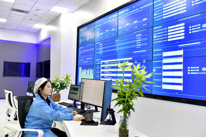 在青岛领智电子科技有限公司,工作人员在SMT物联网数据中心值守。该公司是全球最大的家电控制板供应商之一,其数字化生产系统由海尔卡奥斯工业互联网平台搭建。