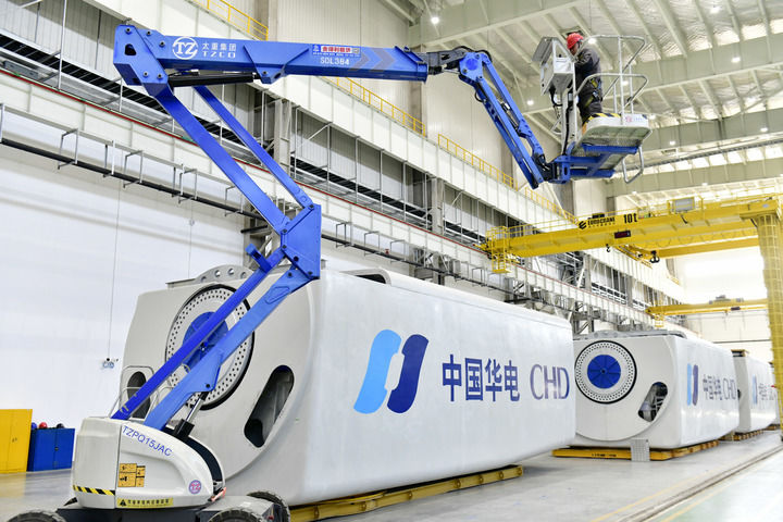 在位于山东省胶州市九龙街道的上海电气上合风电装备产业园,工作人员在组装风电机。