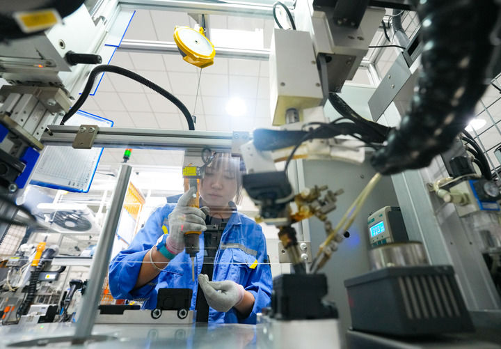 在位于浙江省诸暨市店口镇的浙江万安科技股份有限公司,工作人员在装配汽车角度传感器。