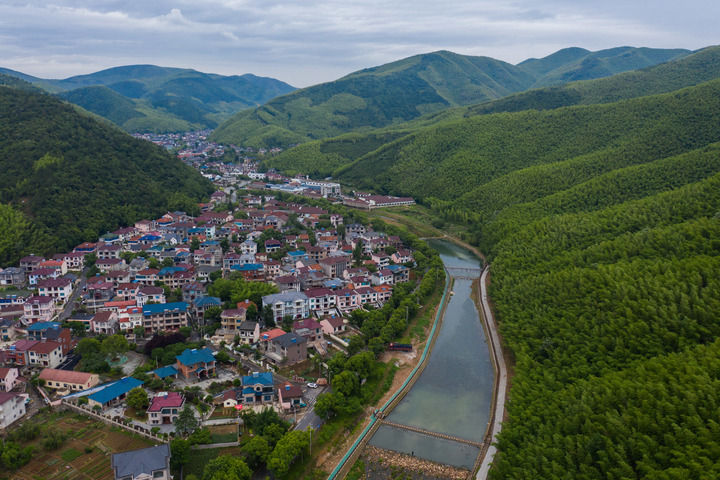 空中俯瞰浙江湖州市长兴县煤山镇新川村。