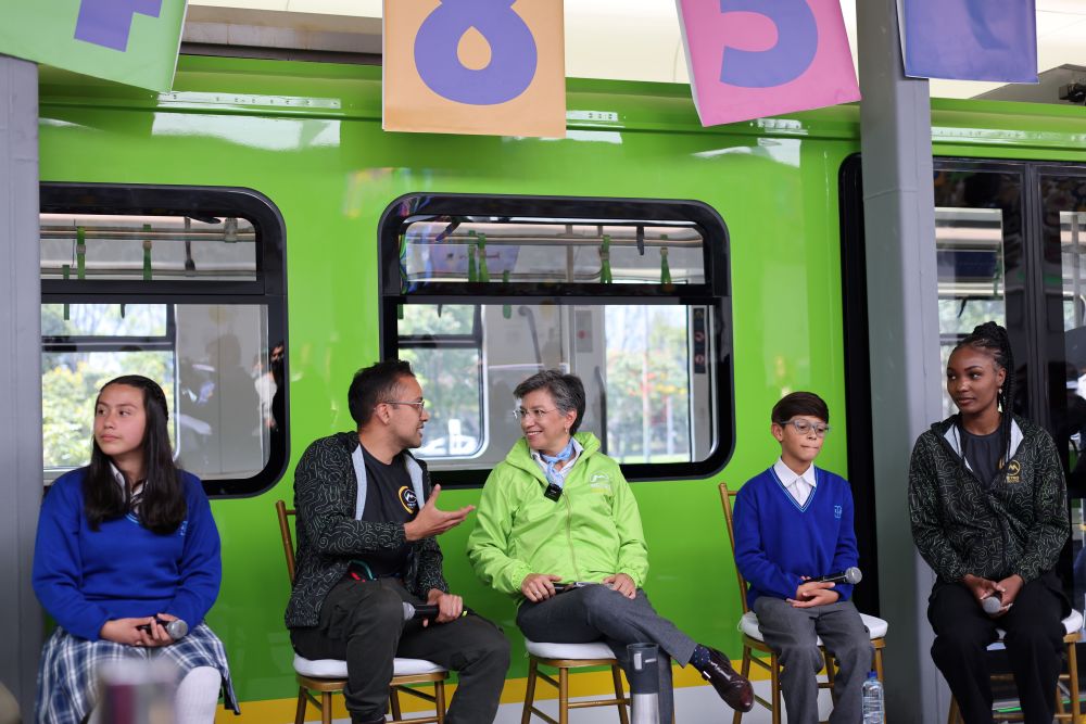 哥伦比亚波哥大市长克劳迪娅·洛佩斯(中)在波哥大地铁的模型车厢旁跟参加活动的师生交流。按照计划,由中企承建和运营的波哥大地铁一号线将在2028年正式投入运营。