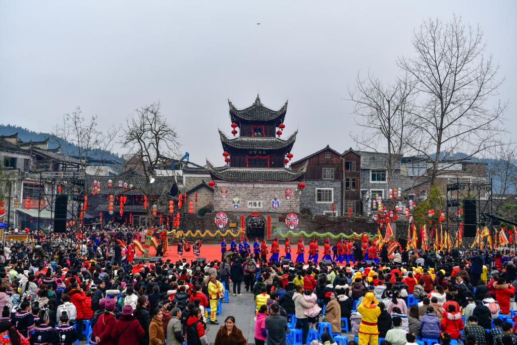 这是贵州锦屏隆里“村晚遇元宵·来隆里玩花脸龙”活动现场。
