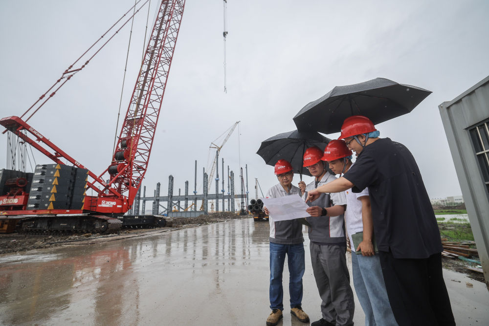 在东方特钢镍铬新材智造项目建设现场,浙江省嘉兴市南湖区驻企“红色专班”党员与企业施工方一起查看项目现场推进情况。