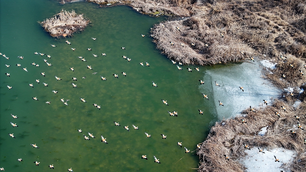 候鸟在黄河宁夏段一处湿地栖息、觅食。