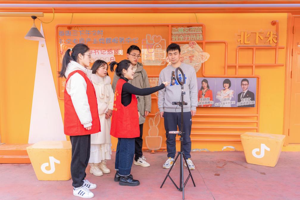 在浙江省义乌市福田街道江北下朱村社交电商产业党群服务中心“驿家亲”红色驿站里,青年交流直播经验。