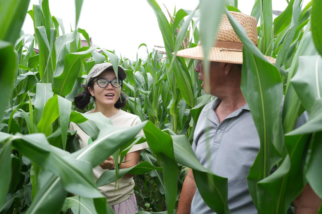 在浙江省台州市椒江区下陈街道横河陈村,青年创业者陈艳(左)在她开设的观光农场内和本地农民讨论庄稼长势。