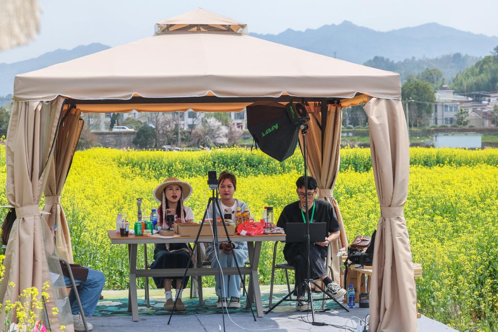 主播在浙江省建德市更楼街道城南城市田园油菜花田边的直播间内推介当地文旅项目。
