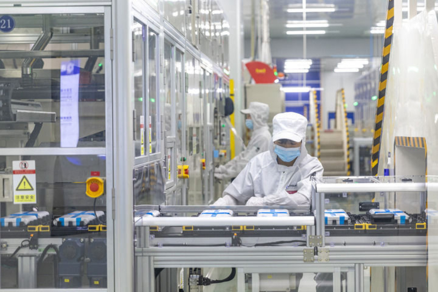 在位于重庆市铜梁区的海辰储能重庆制造基地,工作人员在生产线上初步检测两个电芯是否配对。