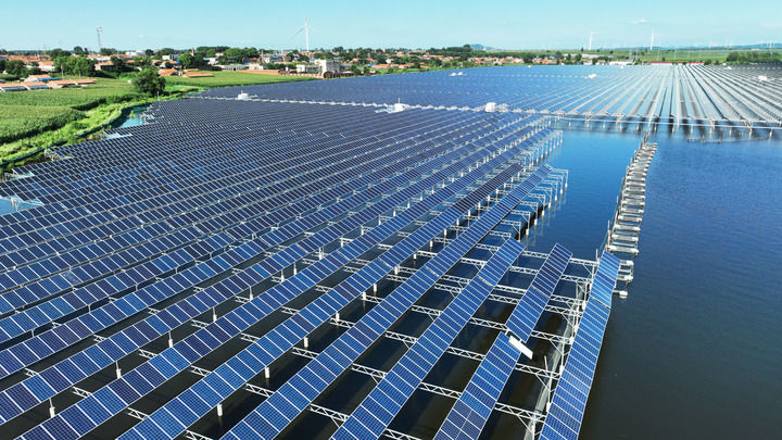 在辽宁省铁岭市铁岭县大青水库拍摄的光伏发电板。