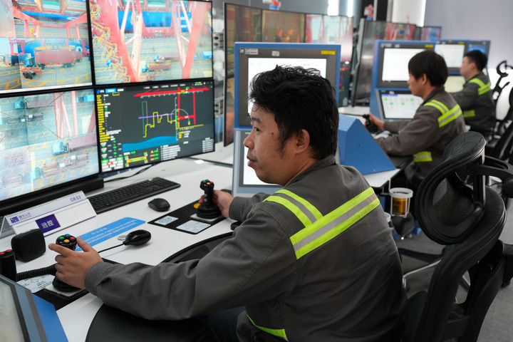 在宁波舟山港梅山港区远控桥吊操作中心,远控桥吊司机对现场船舶进行远程装卸作业。