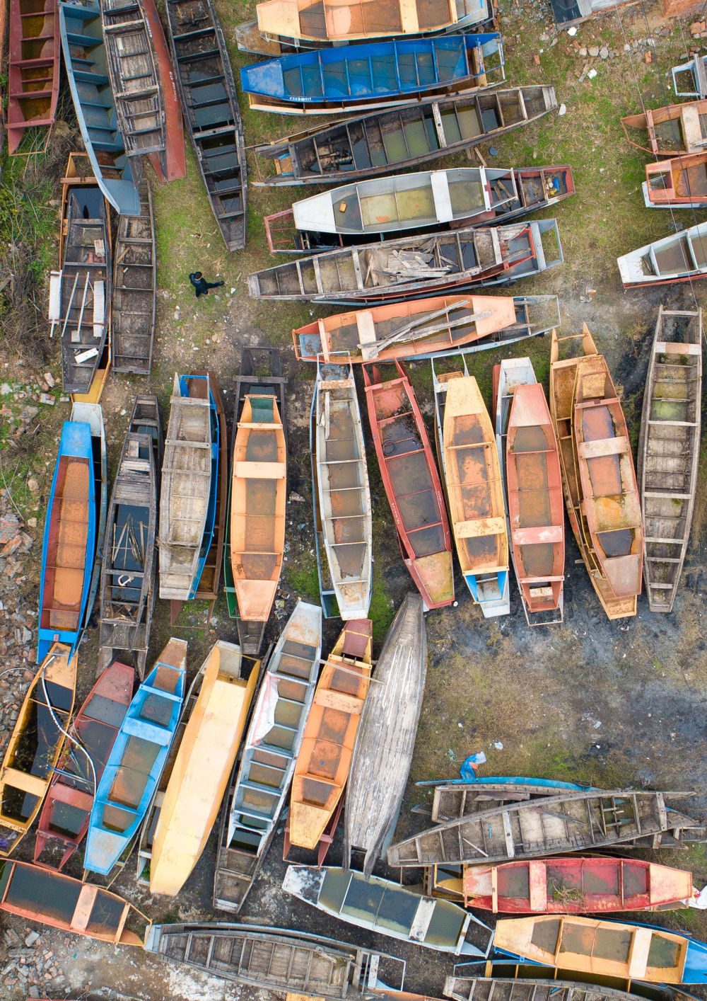 湖北省宜都市枝城镇白水港村一处“上岸”的渔船堆放点。