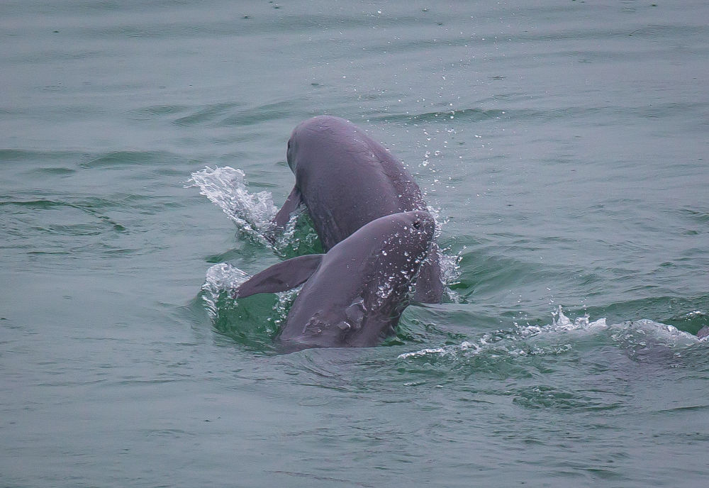 在湖北省宜昌市江边,长江江豚在水中嬉戏。