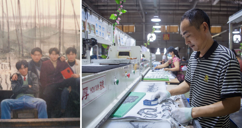 拼版照片:左图为湖北洪湖渔民陈玉祥(左一)与朋友在船上;右图为陈玉祥在湖北洪湖一家鞋业公司工作。陈玉祥曾经在洪湖里整日与渔网、船桨为伴,住船屋、守围网、养螃蟹、捕鱼虾。2017年,陈玉祥一家响应号召上岸,他用购房补贴、扶贫搬迁补偿和政府收购渔船的钱购置了住房,告别了在船屋上风吹雨淋的生活。后来在当地政府的帮助下,陈玉祥接受职业培训后到一家鞋业公司工作。