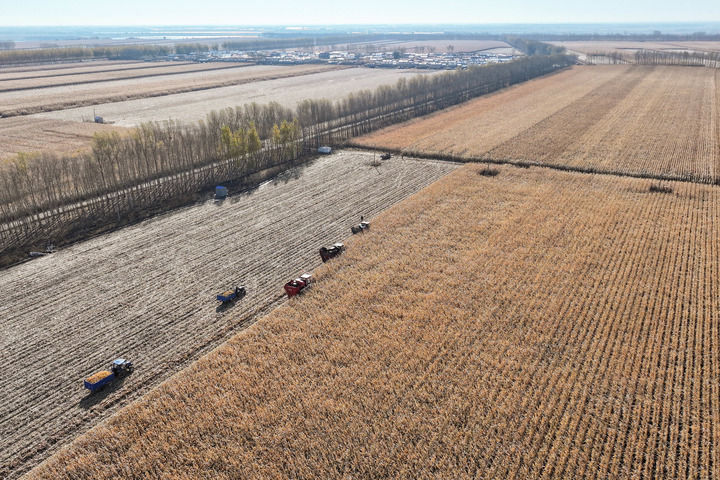 在黑龙江省肇东市五里明镇东升村,农民驾驶农机进行收割作业。