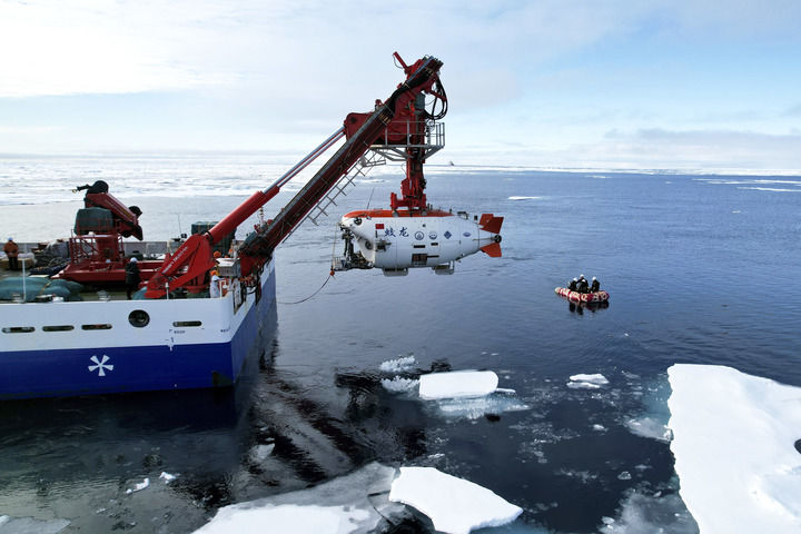 “蛟龙”号在北极冰区准备下潜。