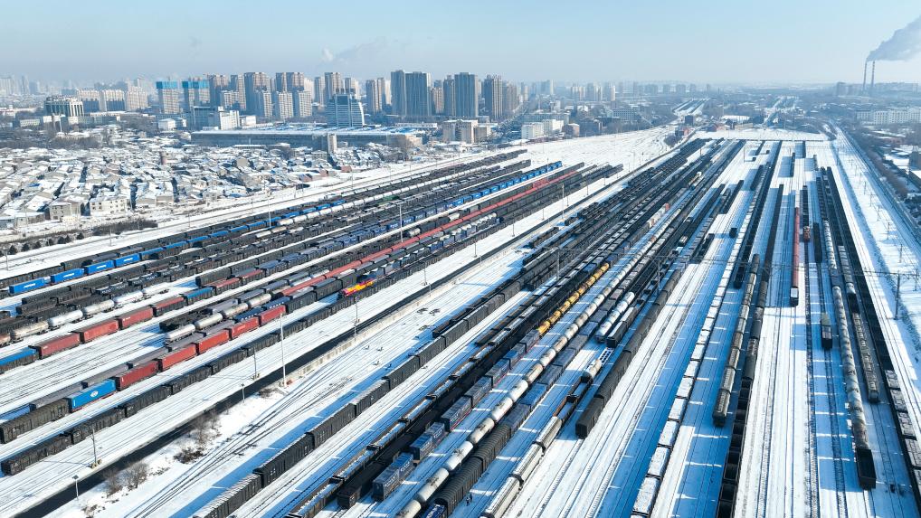 装满物资的货运列车在黑龙江省哈尔滨南站编组站场整装待发。“三九”天以来,针对北方降温降雪天气,中国铁路哈尔滨局集团有限公司哈尔滨南站积极开展电煤、生产物资保供专项行动,全力保障民生物资运输需求。